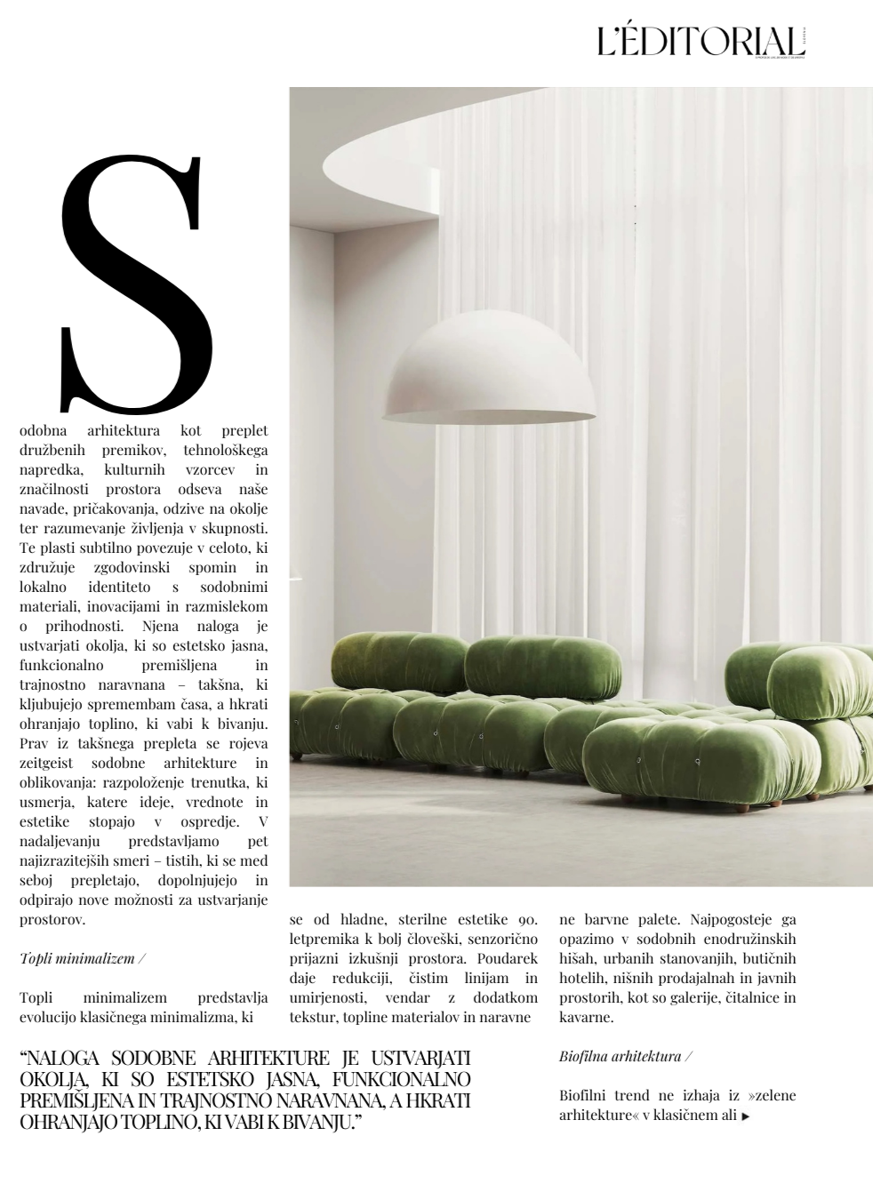 Sodobna arhitektura kot preplet družbenih premikov, tehnološkega napredka, kulturnih vzorcev in značilnosti prostora odseva naše navade, pričakovanja, odzive na okolje ter razumevanje življenja v skupnosti. Te plasti subtilno povezuje v celoto, ki združuje zgodovinski spomin in lokalno identiteto s sodobnimi materiali, inovacijami in razmislekom o prihodnosti. Njena naloga je ustvarjati okolja, ki so estetsko jasna, funkcionalno premišljena in trajnostno naravnana – takšna, ki kljubujejo spremembam časa, a hkrati ohranjajo toplino, ki vabi k bivanju.