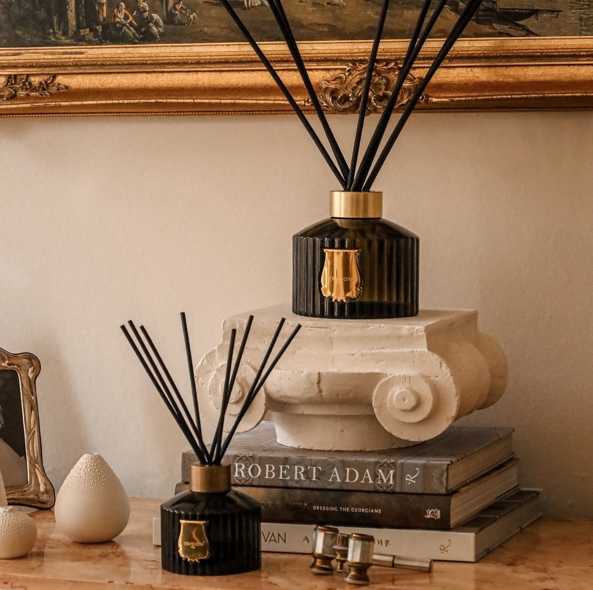 Od leve proti desni: Jo Malone London Peony & Blush Suede Diffusers; Trudon Maduraï Room Spray; Trudon L'Œuf Diffuser - Abd El Kader; Trudon Classic Reed Diffuser - Spiritus Sancti.