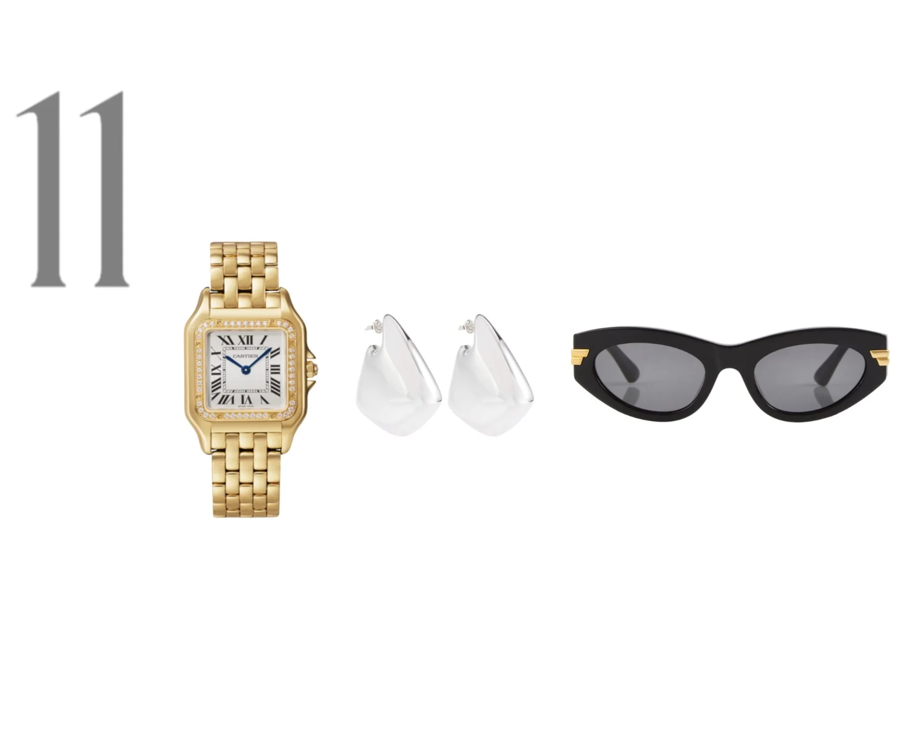 Od leve proti desni: Panthère de Cartier medium 27mm 18-karat gold diamond watch, 35.100 Є (net-a-porter.com); Bottega Veneta Fin Large sterling silver earrings, 1.100 Є; Bottega Veneta Classic oval sunglasses, 370 Є (vse mytheresa.com).