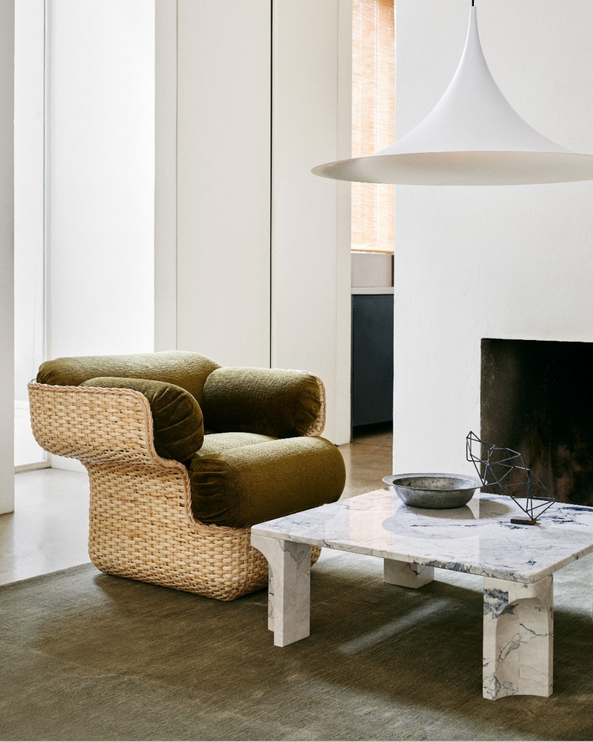 Od leve proti desni: Loewe Anagram wool-blend cushion; Tom Dixon Stone marble portable lamp; Loro Piana Virgin wool blanket; Cassina Kangaroo teak and cane chair.