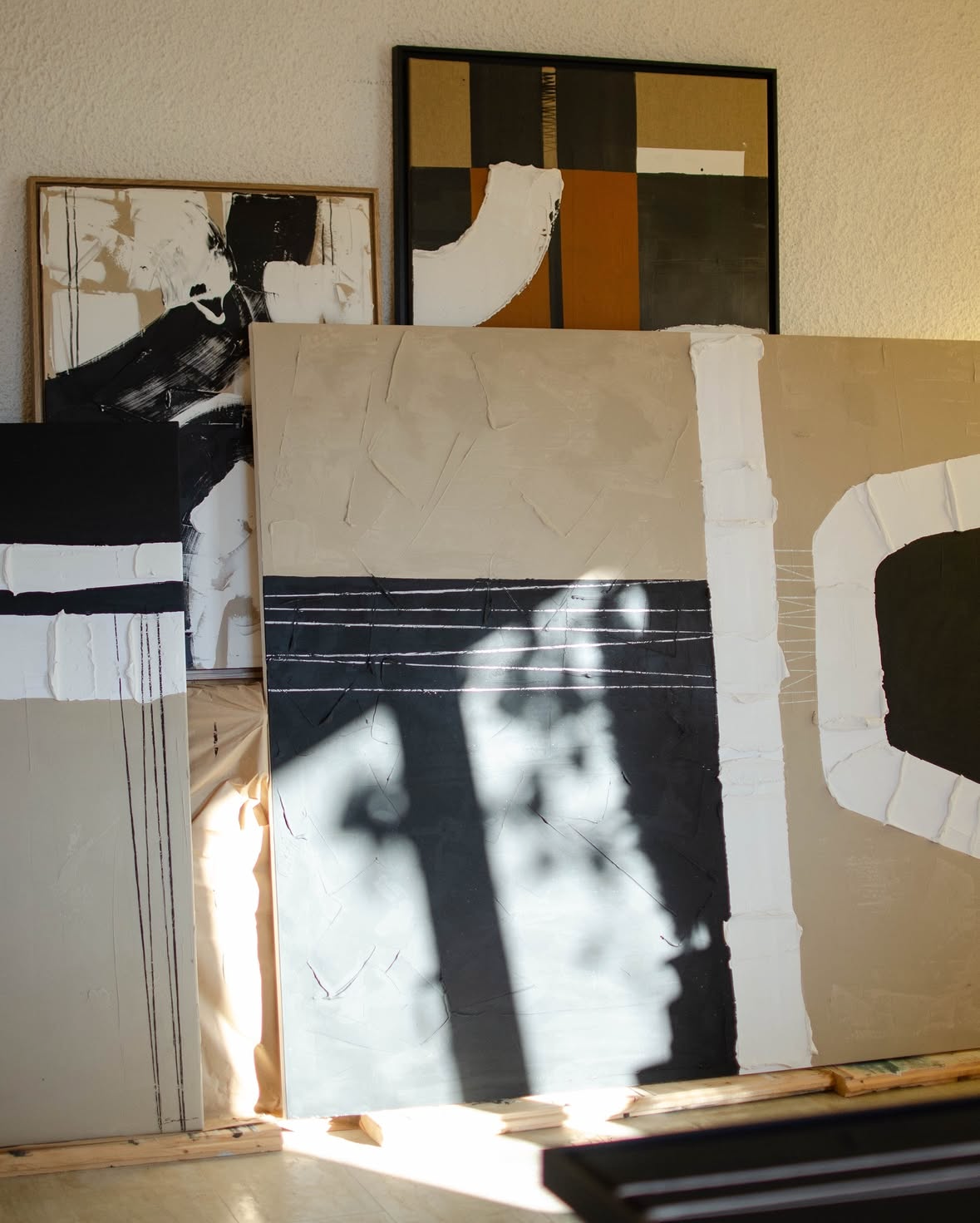 Od leve proti desni: Pantone nevtralna barvna baleta; Trend Gallery Association 266 painting, 120x115cm; FlosTaccia lamp by Achille and Pier Giacomo Castiglioni; Polspotten Roman set of 4 vases.