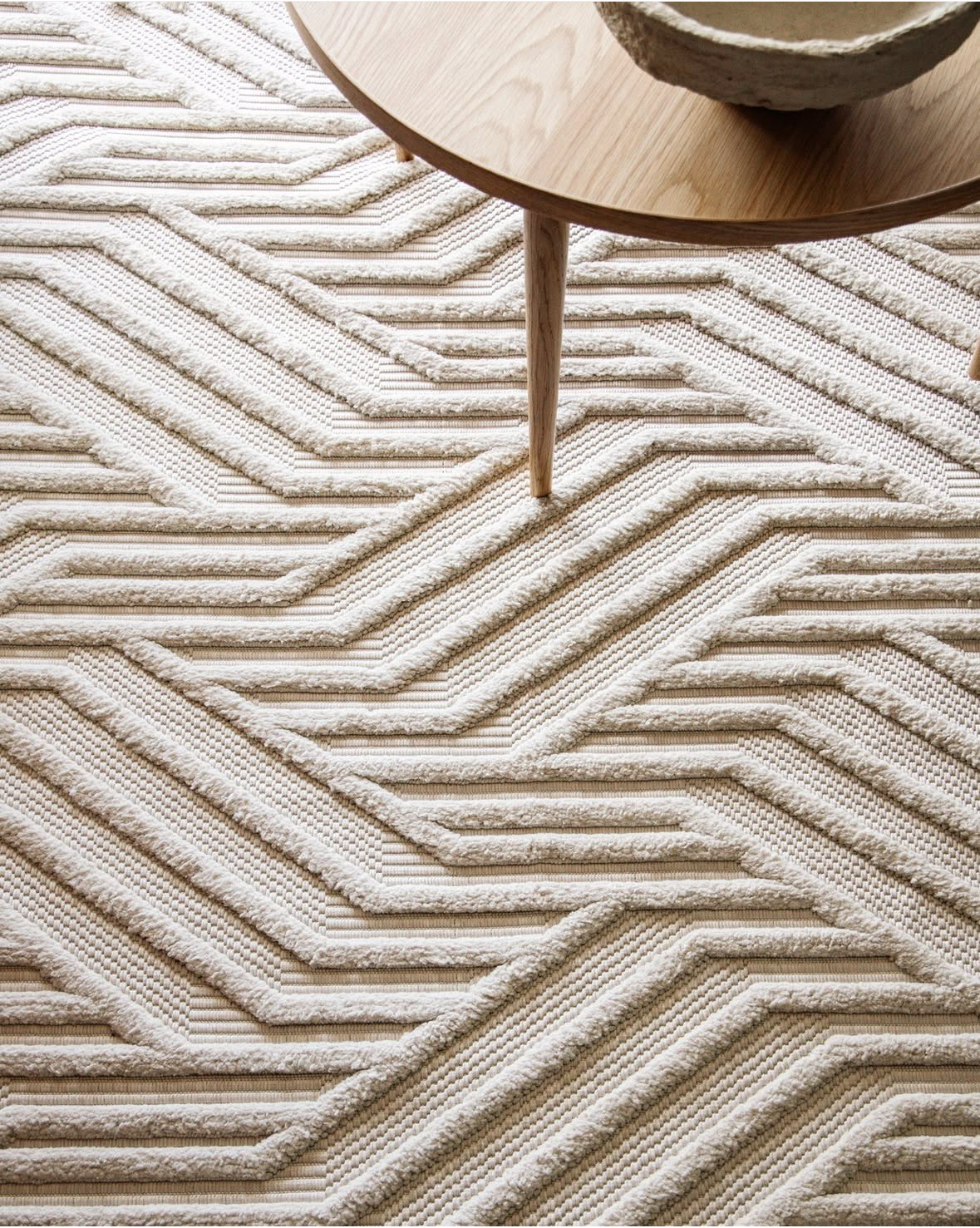 Od leve proti desni: Rugvista Bahia Cream white rug; 101 Copengahen Big foot linen stool; Alexa Lixfeld Cut glass vase; Karakter No. 2 Wooden side table by PlueerSmitt.