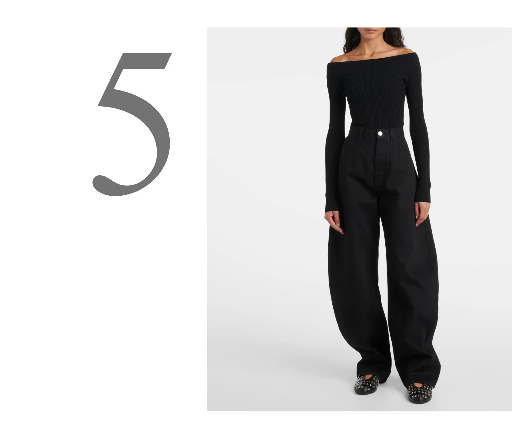 Od leve proti desni: Alaïa Wool wide-leg pants, 1.300 €; Agolde Balloon high-rise barrel-leg jeans, 350 €; Self-Portrait High-rise barrel-leg jeans, 225 €; Alaïa Petal high-rise barrel-leg jeans 990 €.